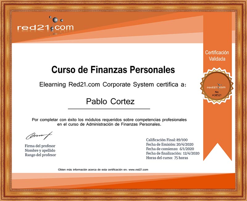 Al presentar, y aprobar la prueba final, recibirás un certificado de Aprobación del curso emitido por la Distance Learning Red21.com Corporate System reconocido por las principales empresas bajo la modalidad de enseñanza privada. A continuación un ejemplo de un certificado.