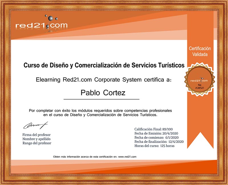 Al presentar, y aprobar la prueba final, recibirás un certificado de Aprobación del curso emitido por la Distance Learning Red21.com Corporate System reconocido por las principales empresas bajo la modalidad de enseñanza privada. A continuación un ejemplo de un certificado.