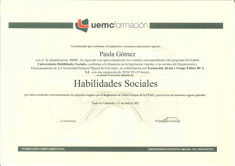 Al finalizar el curso de Asesor de Imagen recibirás una doble certificación en Profesional en Asesoría de Imagen (100 horas) emitido por la Distance Learning Red21.com Corporate System y proyecto final Curso de Habilidades Sociales (15 horas) emitido por la Universidad Europea Miguel de Cervantes que incluye apostillado internacional. La certificación tiene un costo adicional de 115 USD.